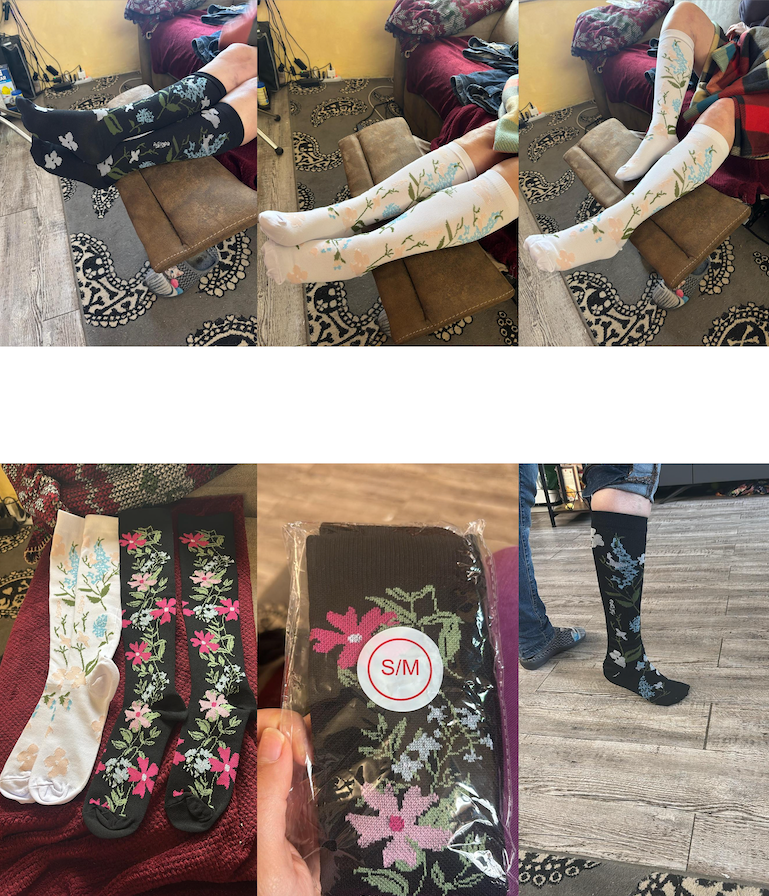 Ho preso il set Nero e ce un paio bianche e il resto nere e i motivi floreali sono semplicemente stupendi — finalmente delle calze a compressione che uniscono stile e femminilità e fanno il loro lavoro.🌸Sono leggere, morbide e offrono un ottimo supporto alle gambe.